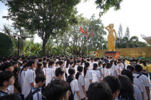 Ngay từ khi khởi hành, không khí trên xe đã vô cùng sôi nổi khi các em được lắng nghe hướng dẫn viên giới thiệu về lịch sử, đặc điểm địa lý, kinh tế của những vùng đất mà đoàn đi qua, mở đầu cho một ngày học tập liên môn đầy hứng khởi. Điểm dừng chân đầu tiên và cũng là trọng tâm của hoạt động giáo dục ngoại khóa là Khu lưu niệm và Đền thờ nữ Anh hùng liệt sĩ Võ Thị Sáu. Trong không khí trang nghiêm, quý thầy cô và học sinh trưởng THPT chuyên Trần Đại Nghĩa đã thành kính làm lễ dâng hương, bày tỏ lòng biết ơn vô hạn trước sự hy sinh anh dũng của người con gái Đất Đỏ kiên trung. Tại đây, những bài học Lịch sử, Địa lý, Giáo dục địa phương và Giáo dục công dân không còn nằm trên trang sách mà trở nên sống động, sâu sắc hơn bao giờ hết. Các em đã được tận mắt chứng kiến những hiện vật tại nhà tưởng niệm, cảm nhận sâu sắc cuộc sống giản dị mà phi thường của chị Sáu qua ngôi nhà lưu niệm được phục dựng, từ đó bồi đắp thêm niềm tự hào dân tộc và ý thức trách nhiệm của thế hệ trẻ.