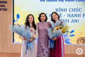 Cô Triệu Phạm Trà Mi – Tổ trưởng tổ Hoạt động trải nghiệm – Hướng nghiệp và Giáo dục địa phương tặng hoa cho cô Nguyễn Thị Ngân Sương và cô Vũ Thị Thu Huyền